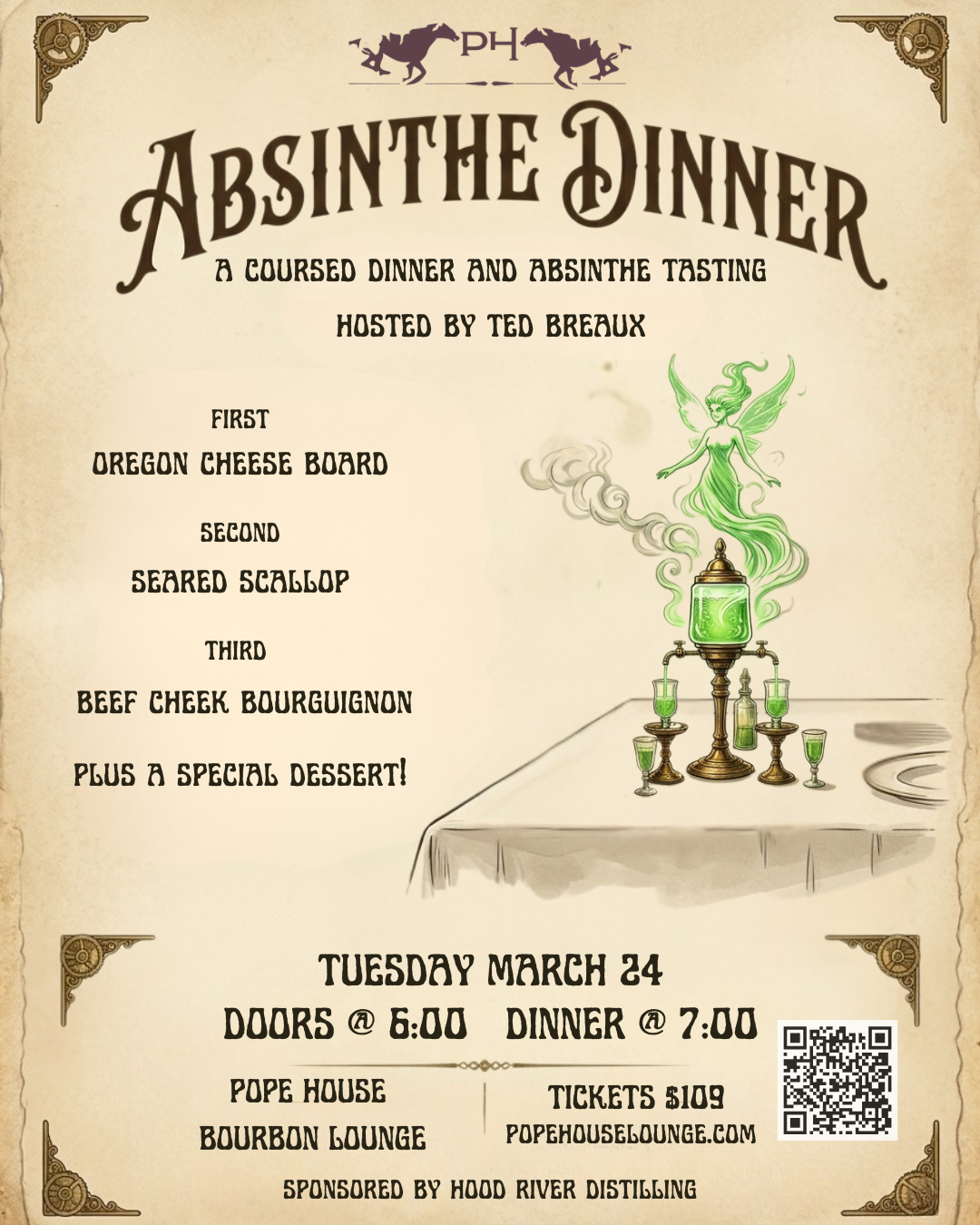Join us for a special coursed dinner featuring special guest Ted Breaux, master distiller and creator of Lucid Absinthe. Ted is an expert in the world of absinthe and will be our guide as we experience this unique spirit, complemented with French cuisine.